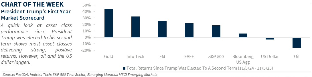 • Trump’s First-Year Scorecard | This week marks one year since President Trump was elected to the White House for a second, non-consecutive term. Despite bouts of volatility—especially after Liberation Day (April 2)—the economy and markets have held up better than many expected amid ongoing trade wars. Growth is on track to reach 1.8% in 2025, and while inflation remains elevated, it’s been milder than anticipated given the steepest tariff hikes in nearly a century. For investors, most major asset classes have extended last year’s gains: the S&P 500 is up +19%, S&P Tech sector +32%, EAFE +22%, MSCI EM +26%, Bloomberg Aggregate Bond Index +6.0.%, and gold is up an impressive 44% since Election Day. Notable laggards include oil, down 17%, and the US dollar, off 3%. These trends echo Trump’s first term—except for gold and oil. The downside: A prolonged government shutdown could add near-term economic risks to an already slowing backdrop—marked by weaker job growth, the highest October layoffs since 2003, and pressured consumer spending. It could also further weigh on his approval rating, which is already at its lowest level this year (+43% in RealClear Politics average).